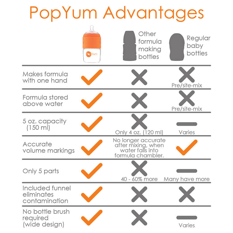 ONLY 5 PARTS: PopYum has the same number of parts as many regular baby bottles and has up to 60% fewer parts as compared to other formula making bottles! The wide design eliminates the need to for a bottle brush (you can just use a regular sponge) and it’s top rack dishwasher safe.